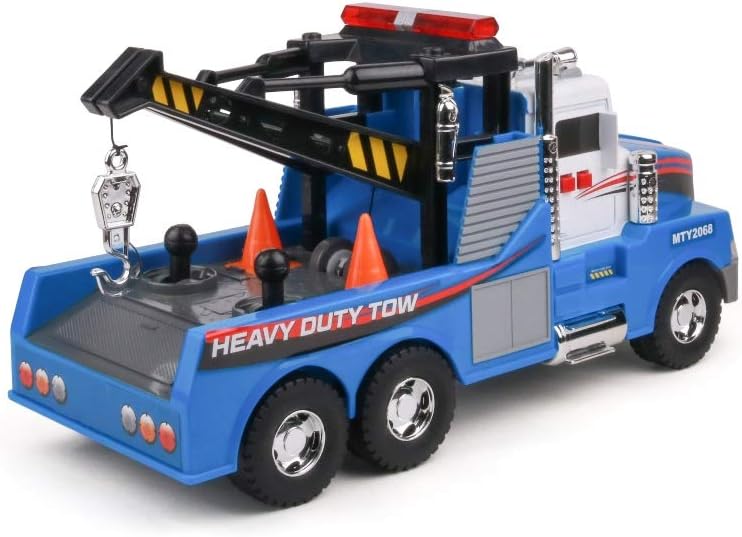 Featuring polished aluminum. This life-like Tow Truck also features 2 traffic cones to help keep the public safe as you work realistic sounds and flashing lights. HttpamzntoZBK9p9AMAZONCOM UNDER 20 usd.