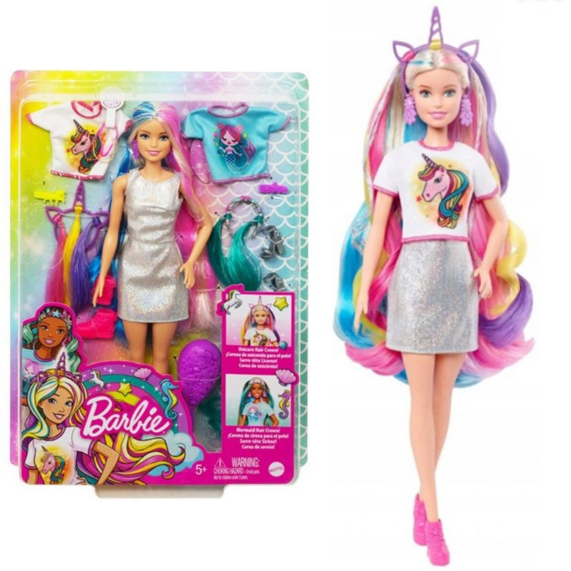 Unicorn or mermaid Barbie Fantasy Hair doll doesnt need to choose -she comes with two fantasy looks that each include a colorful crown with hair extensions themed top and accessories. Amazons Choice for unicorn barbie doll. Both Barbie doll and her unicorn have long colorful locks for storytelling and hairstyling fun.