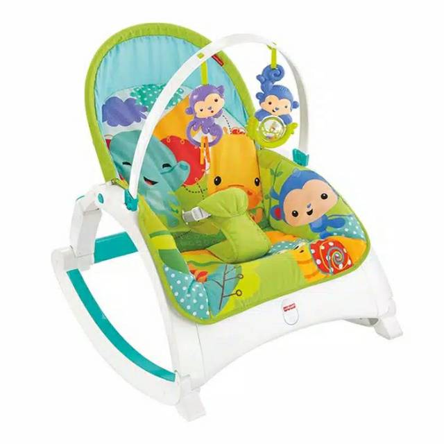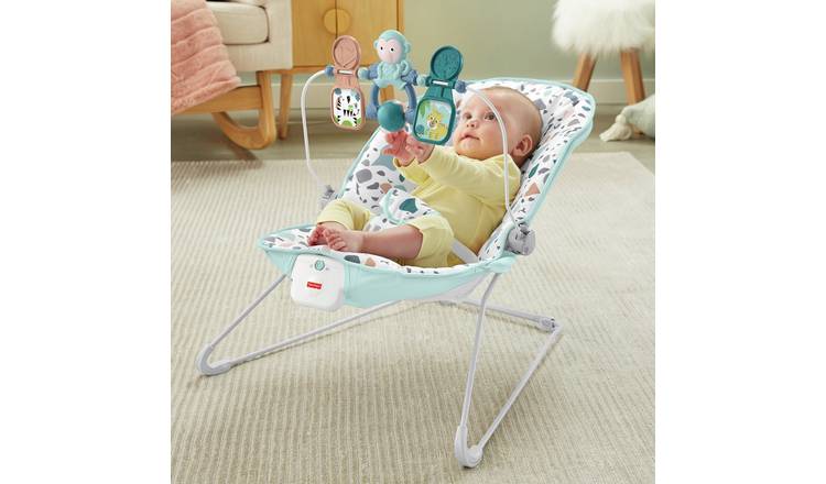 The overhead toy bar is perfect for playtime with three fun animal toys that clack and spin for plenty of bat-at fun. This baby chair gently bounces along to your little ones natural movements and features calming vibrations at the touch of a button. Your little ones natural movements set the Fisher-Price Babys Bouncer in motion gently bouncing to help comfort and soothe baby.